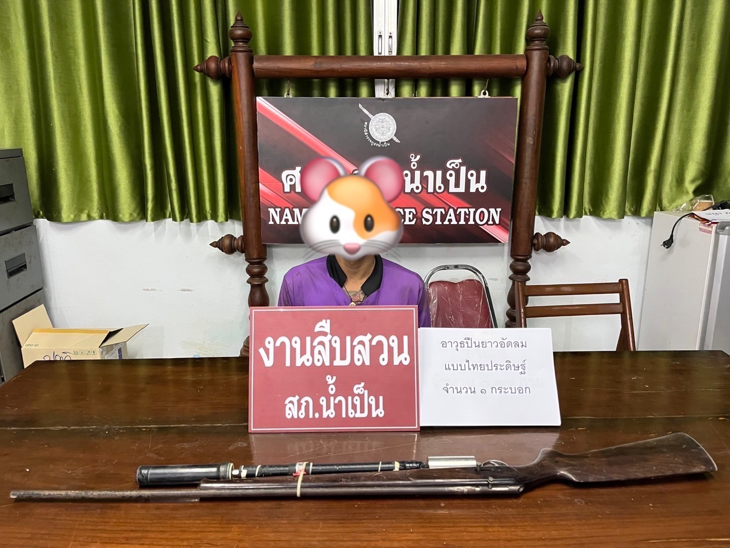 เมื่อวันที่ ๒๗ มกราคม พ.ศ.๒๕๖๘ ภายใต้อำนวยการของ พ.ต.ท.คมกฤต แจ่นประโคน สว.สภ.น้ำเป็น ชุดสืบสวน สภ.น้ำเป็น ได้มีการจับกุม ฐานกระทำความผิด “มีอาวุธปืนยาวอัดลมแบบไทยประดิษฐ์(ไม่มียี่ห้อและหมายเลขทะเบียน)ไว้ในครอบครองโดยไม่ได้รับอนุญาต” สถานที่จับกุม บริเวณหน้าขนำไม่มีเลขที่ หมู่ ๗ ตำบลน้ำเป็น อำเภอเขาชะเมา จังหวัดระยอง นำตัวผู้ต้องหาพร้อมของกลางส่งพนักงานสอบสวน สภ.น้ำเป็น เพื่อดำเนินการตามกฎหมายต่อไป